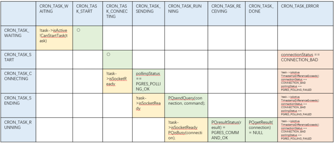 pg_cron 插件的主体是围绕 PG_CRON_TASK 进行,从内部来说, PG_CRON_TASK 有自己的生命周期,其生命周期的轮转过程就是插件的运行过程,从外部来说 PG_CRON_TASK 与 PG_CRON_JOB 通信取得当前的任务列表,在运行状态与 POSTMASTER 通信 完成定时任务的运行。