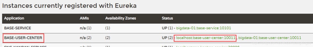 在这个demo中,我创建了一个名叫base-user-center的服务,在启动后,可以在Eureka管理界面看到该服务。