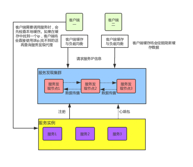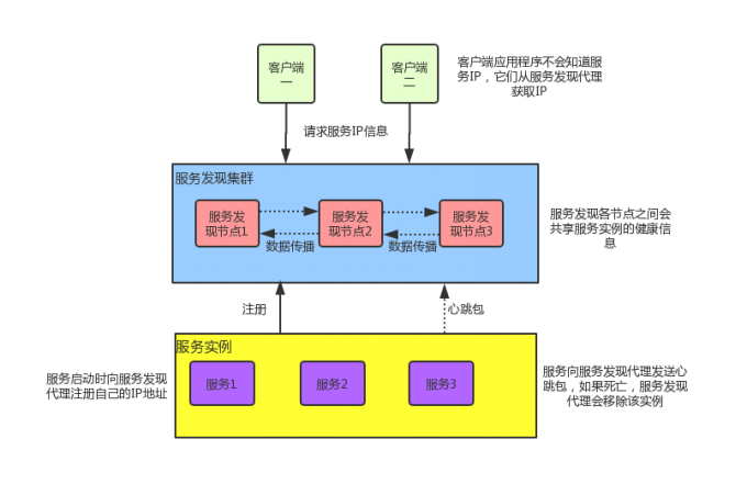 每个服务实例启动时会通过一个或多个服务发现代理进行注册它们的IP等信息,但即使只在一个服务发现节点注册。由于服务发现代理间使用了数据传播的点对点模型,每个节点的数据都会同步到服务发现集群中的所有节点。