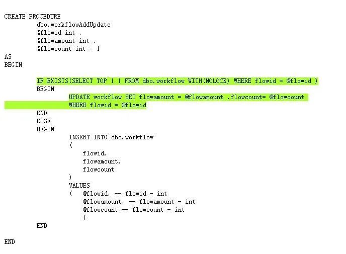 CREATE TABLE [dbo].[workflow]( [flowid] [INT] NULL, [flowamount] [INT] NULL, [flowcount] [INT] NULL) ON [PRIMARY]GOWITH L0AS (SELECT * FROM ( VALUES (1), (2), (3) ) AS T (C) ), L1AS (SELECT a.C, b.C AS BC FROM L0 AS a CROSS JOIN L0 AS b), L2AS (SELECT a.C, b.C AS BC FROM L1 AS a CROSS JOIN L1 AS b), L3AS (SELECT a.C, b.C AS BC FROM L2 AS a CROSS JOIN L2 AS b), L4AS (SELECT a.C, b.C AS BC FROM L3 AS a CROSS JOIN L3 AS b), L5AS (SELECT a.C, b.C AS BC FROM L4 AS a CROSS JOIN L4 AS b)INSERT INTO dbo.workflow( flowid, flowamount, flowcount)SELECT TOP 50000 RNK, RNK * 10, RNK + 20FROM(SELECT ROW_NUMBER() OVER (ORDER BY (SELECT NULL)) AS RNK FROM L5) M;GO CREATE PROCEDURE dbo.workflowAddUpdate @flowid int , @flowamount int , @flowcount int = 1 AS BEGIN IF EXISTS(SELECT TOP 1 1 FROM dbo.workflow WITH(NOLOCK) WHERE flowid = @flowid ) BEGIN UPDATE workflow SET flowamount = @flowamount ,flowcount= @flowcount WHERE flowid = @flowid END ELSE BEGIN INSERT INTO dbo.workflow ( flowid, flowamount, flowcount ) VALUES ( @flowid, -- flowid - int @flowamount, -- flowamount - int @flowcount -- flowcount - int ) END END GO