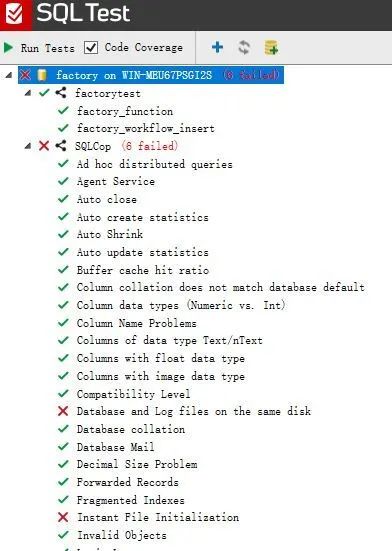 如果写的测试用例没有语法问题,factorytest 下面写好的测试用例都会成功跑完,而 SQLCop 会帮我们把配置错误或不合理的地方抓出来。SQLCop 涉及到 DBA 的范畴,暂且不谈,先说测试覆盖率。