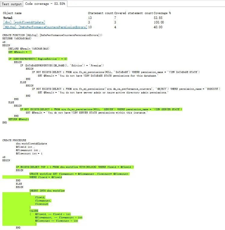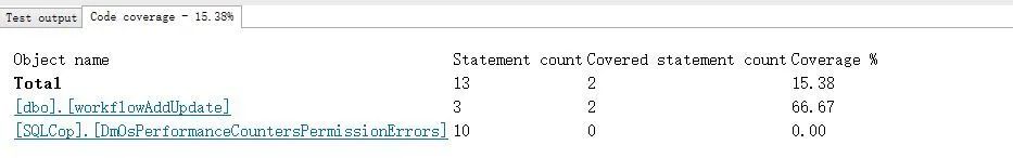 这就是测试覆盖率报告。dbo.workflowAddUpdate 就是要测试的存储过程,可以看到有 3 个测试入口,而我们的测试用例(参数)只测试到了 2 个入口,测试覆盖率就是66.67. 剩下的一个入口没有测到,那么说不到哪天,新的参数传进来了,会出现 bug.