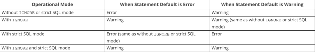 当DML语句主要是 insert 带上了 IGNORE 关键字 ,此时SQL MODE 又是 严格模式的情况下,数据库是如何表现的呢?官方给的对比图。
