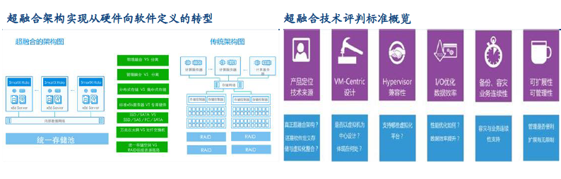 超融合技术实现原理核心是以软件定义存储(SDS)替代了传统融合系统中的存储区域网络(SAN),主要技术是构筑于标准服务器硬件上的软件定义存储加(服务器)虚拟化。并且相关核心技术不断升级,超融合方案在适用性、兼容性、数据效率、连续性及可扩展性方面都有了较大的提升。