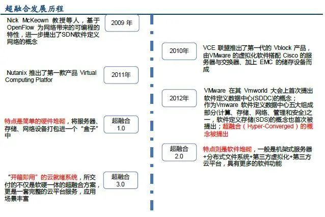 超融合已从1.0 阶段发展至3.0 阶段,服务云平台化趋势明显,应用场景不断丰富。超融合1.0,特点是简单的硬件堆砌,将服务器、存储、网络设备打包进一个“ 盒子 ” 中;超融合2.0,其特点则是软件堆砌,一般是机架式服务器+分布式文件系统+第三方虚拟化+第三方云平台,具有更多的软件功能。