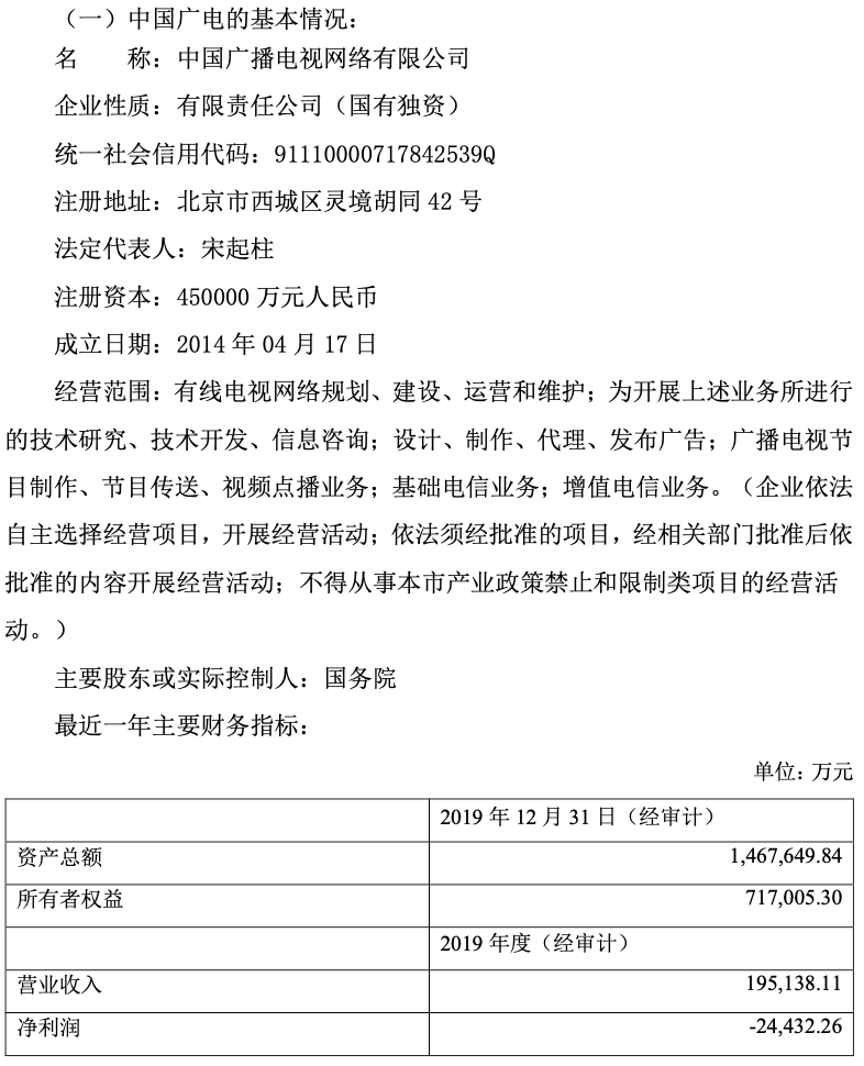 中国广电的第一大股东是中国广播电视网络有限公司,其认缴出资额为516.1亿元、持股51%;截止2019年年底,国网公司总资产146.76亿元,所有者权益71.7亿元,去年实现营收19.5亿元,净利润-2.44亿元。
