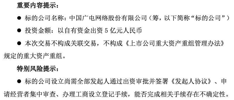 值得一提的是,除了上市公司以外,中国广电的股东阵容颇为豪华,特别是,作为战略投资者的阿里与国家电网双双拿出100亿元入股,这也让还未诞生的中国广电有了混改基因。