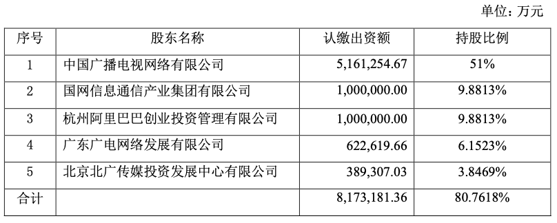 国网信通和阿里创投的认缴出资额均为100亿元,持股比例也均为9.8813%,一同位列中国广电第二大股东。