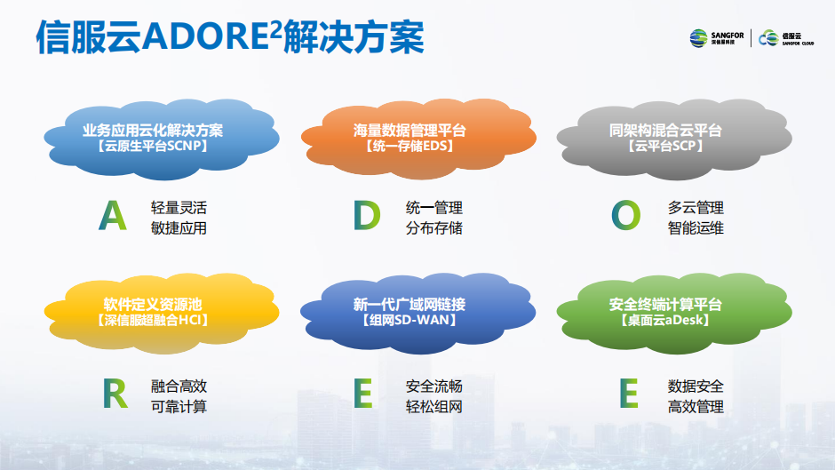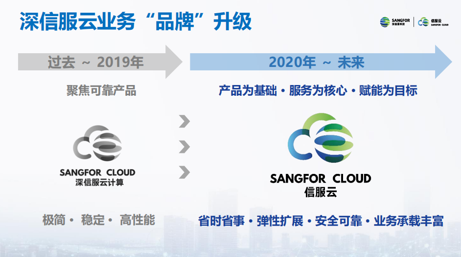 这一次,深信服不再围绕超融合为中心,而是以产品为基础,服务为核心,赋能为目标,推出了全新的云计算品牌“信服云”,开启了从云产品向云服务的全面转身。