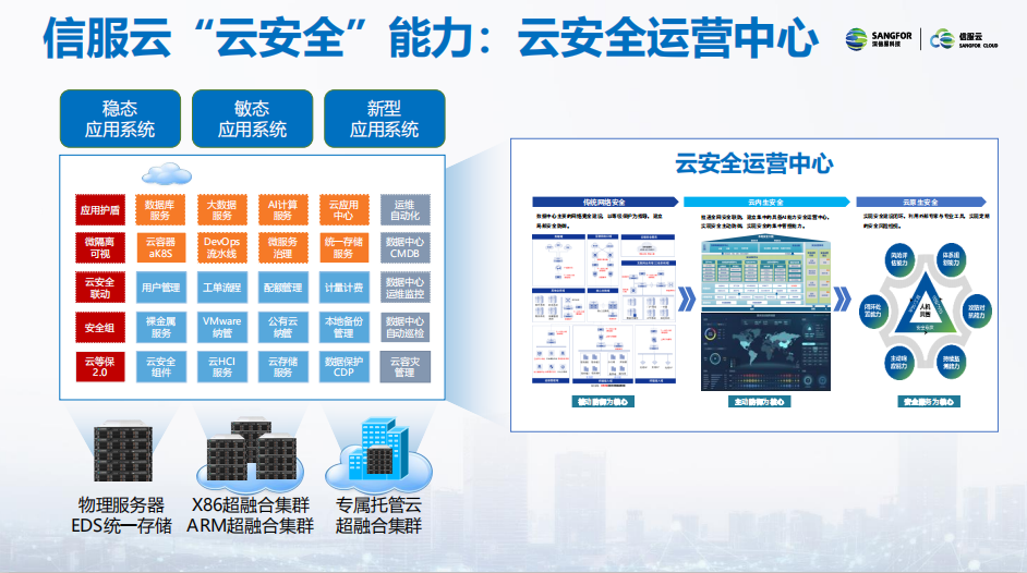 在云原生方面,深信服在原有的容器云产品基础上,进行了产品化的完善和加固,提供一站式开发运维管理,并提供“基于超融合承载云原生平台”和“基于云计算平台集成云原生平台”两种部署模式。