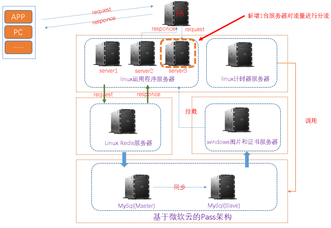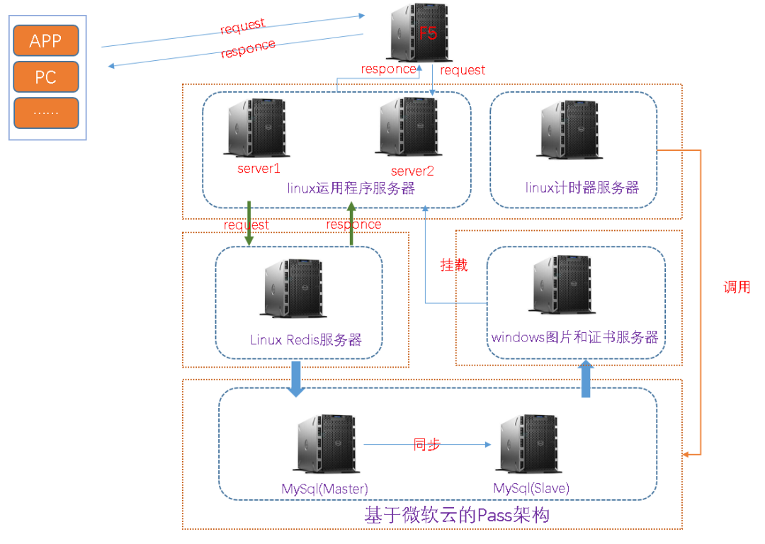 服务器类别:1 台负载均衡服务器(F5),3 台运用程序服务器,1 台计时器服务器,1 台 Redis 服务器,1 台图片服服务器和 1 台基于 Pass 架构的 MySQL 主从服务器(微软云)。