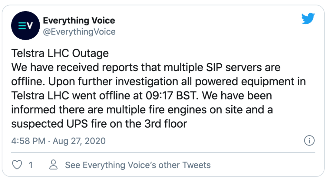 今天早上,四辆消防车和“约25名消防员”紧急赶往伦敦道格斯岛(Isle of Dogs)的澳洲电信(Telstra)数据中心火灾现场。伦敦消防队已证实:“建筑物第三层一间补给室的一小部分已被大火烧毁。”火灾发生在位于E14格林威治景观广场6号的Telstra伦敦托管中心(LHC),导致建筑物的一半断电。该公司在其求助热线的一条录音消息中表示,这意味着它“失去了绿色系统:绿色系统为建筑物的下半部分供电。“大火导致支持母线的断路器出故障。工程师们正在现场,竭力通过发电机来恢复电力。”消防员在08点31分接到火警,09点30分扑灭了火情。未经证实的报道表明,大火是不间断电源(UPS)出故障引起的——同一个问题曾导致8月18日Equinix的LD8数据中心出现了14个小时的停机;对于数据中心提供商们来说,这真是糟糕的一个月。LHC是一幢九层楼的建筑物,拥有逾114000平方英尺的数据中心场地,可容纳1800多个IT机架。该站点是第一个为Telehouse提供替代托管服务的站点,于1999年初投入运营。澳大利亚PTT Telstra于2004年9月收购了其运营商,包括伦敦托管中心。Colo-X网站特别指出,早期的租户“包括Digital Island(先被英国大东电报局收购,后被沃达丰收购)、FLAG(现为Reliance/Global Cloud Exchange的一部分)和Savvis(现隶属Centurylink)。”它补充道:“与伦敦道克兰码头区的所有设施一样,由于该站点有些年头,LHC选择的网络相当可靠,但没有Telecity/Equinix、DRT或Telehouse附近运营的与电信运营商中立的站点那么好。”