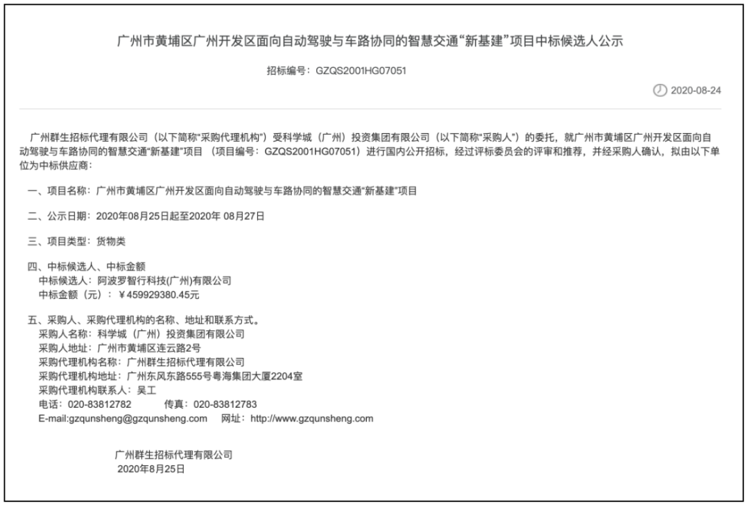 2020年8月28日,百度Apollo旗下子公司阿波罗智行科技(广州)有限公司中标“广州市黄埔区广州开发区面向自动驾驶与车路协同的智慧交通‘新基建’项目”,采购人为科学城(广州)投资集团有限公司,项目金额接近4.6亿元。该项目金额或为今年国内智能交通领域的最大招标项目订单。根据招标项目规划,广州开发区与百度Apollo的近4.6亿元的项目订单包括车路协同路网基础设施、智能路口、车联网等相关应用系统的建设,这将加速推动广州开发区以及粤港澳大湾区智能网联示范高地建设。