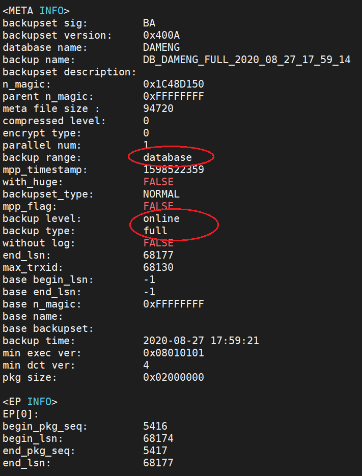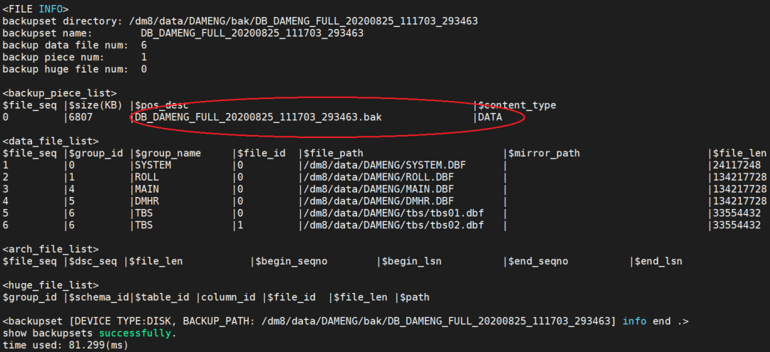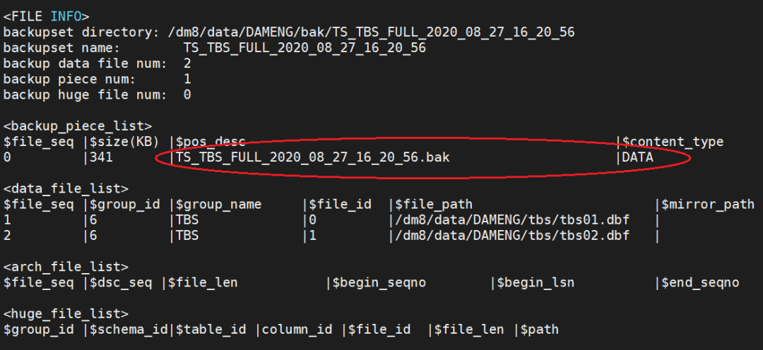 DMRMAN>show backupset '/dm8/data/DAMENG/bak/TS_TBS_FULL_2020_08_27_16_20_56';