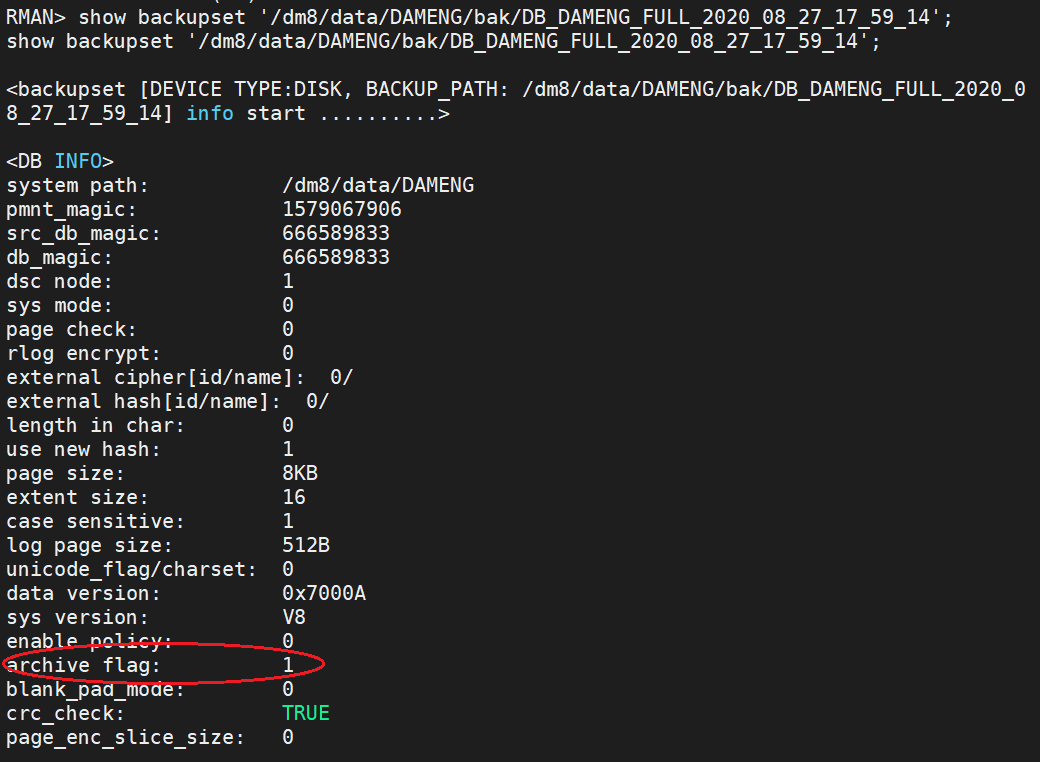 RMAN>show backupset '/dm8/data/DAMENG/bak/ARCH_2020_08_27_22_36_47';