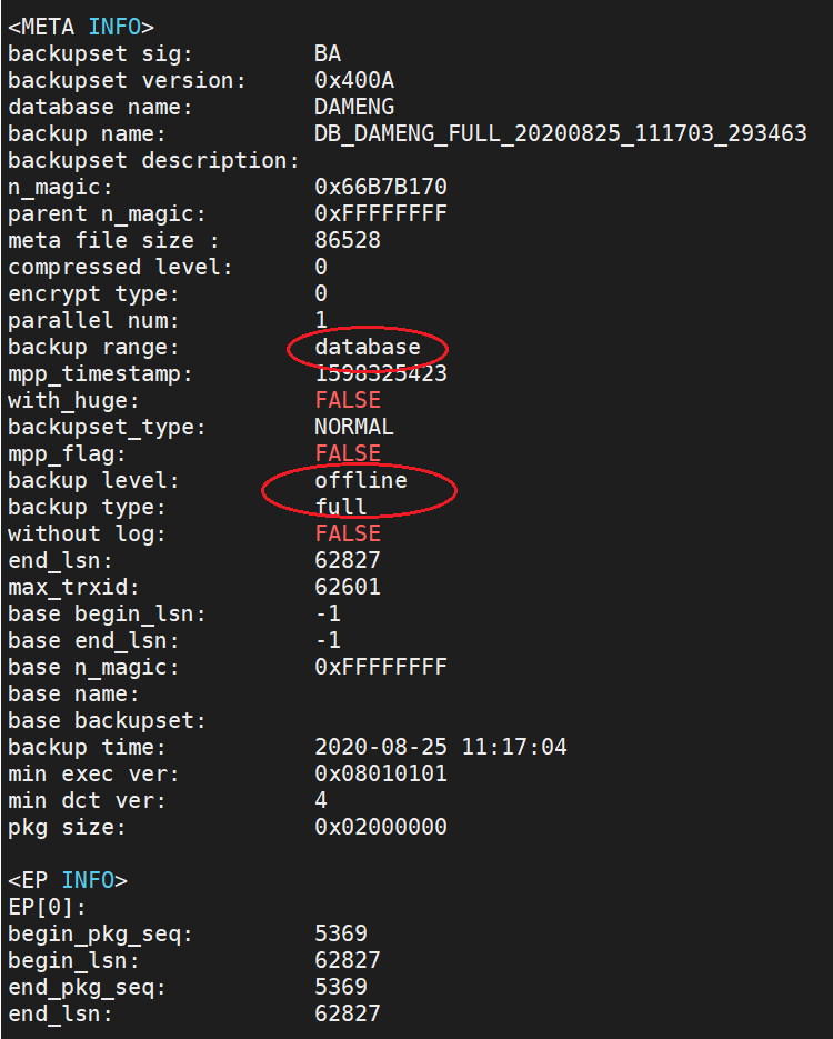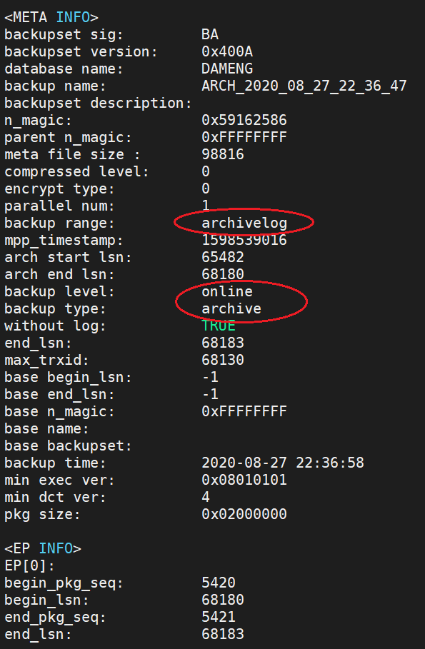 结果展示如下。其中,META INFO中备份范围显示为归档备份,备份方式显示为联机备份。