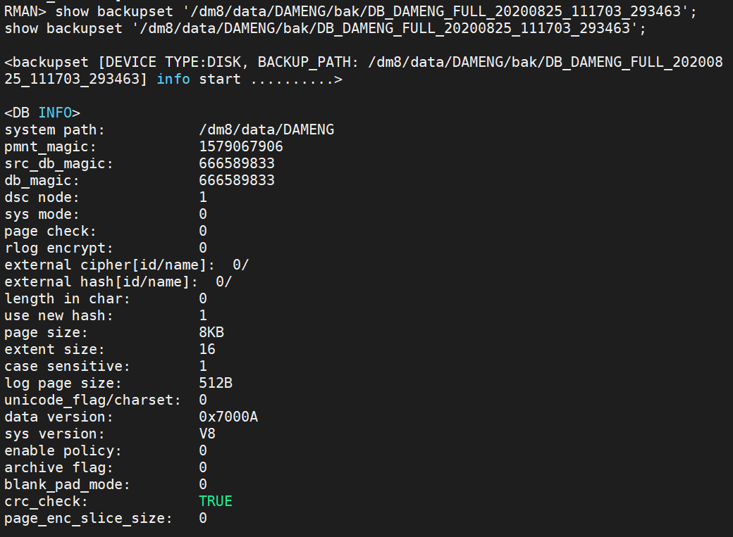 RMAN>show backupset '/dm8/data/DAMENG/bak/DB_DAMENG_FULL_2020_08_27_17_59_14';