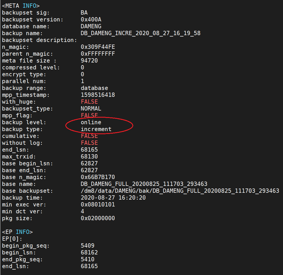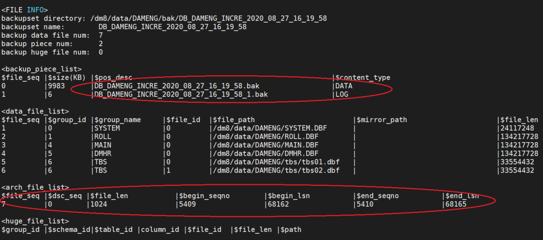 RMAN>show backupset '/dm8/data/DAMENG/bak/DB_DAMENG_INCRE_2020_08_27_16_19_58';