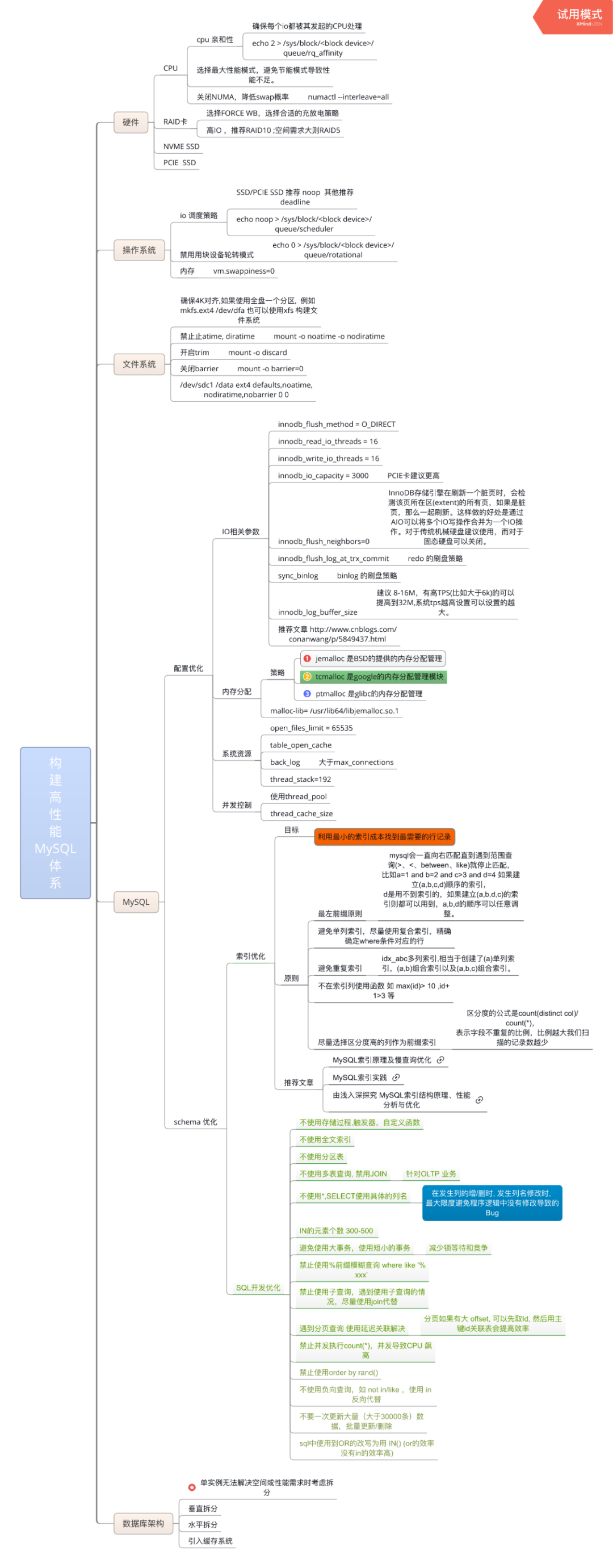 这张思维导图从硬件,os系统,文件,MySQL 系统参数,以及开发规范和数据库架构几个层面总结相关参数设置。