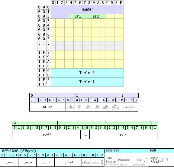 定长的行指针(4字节,严格来说这不算元组的一部分,但它与元组一一对应) 变长的首部 固定长度部分23字节 当元组中存在空值时,会出现空值位图,每个字段占一位,故其长度为字段数除以8。 在空值位图后需要填充至 MAXALIGN