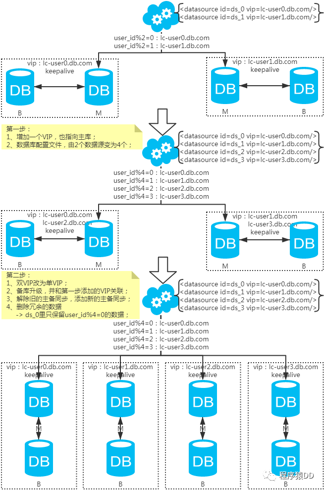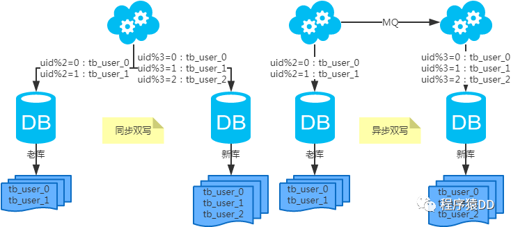 注:扩容是成倍的。 水平扩容表(双写迁移法)