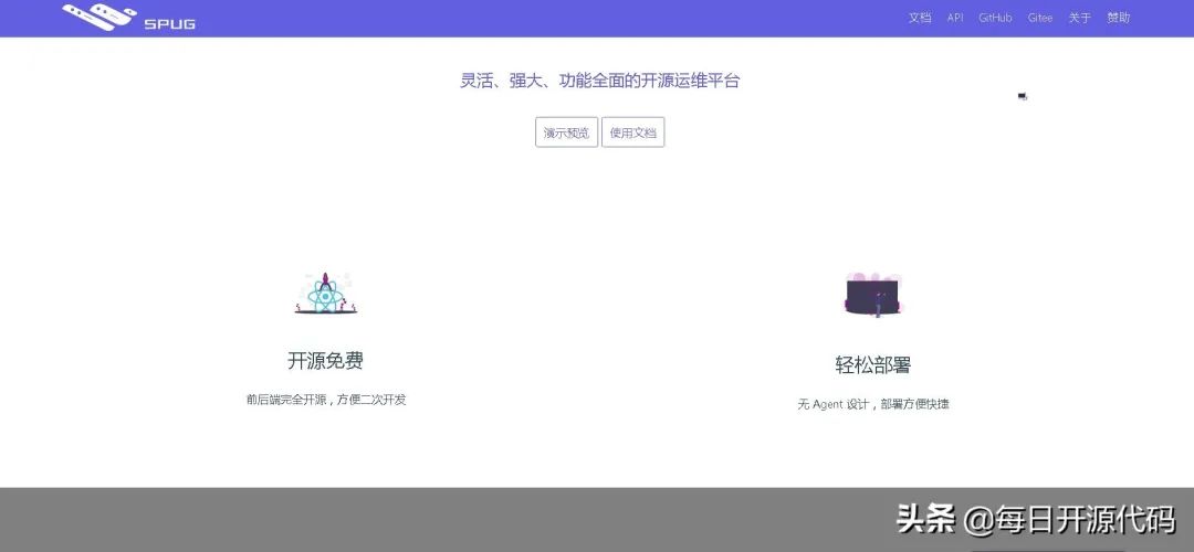 Spug 面向中小型企业,无 Agent,十分轻量,整合了主机管理、主机批量执行、主机在线终端、应用发布部署、在线任务计划、配置中心、监控、报警等一系列功能,使用方便,功能灵活,能够满足一般的应用自动化部署需求。