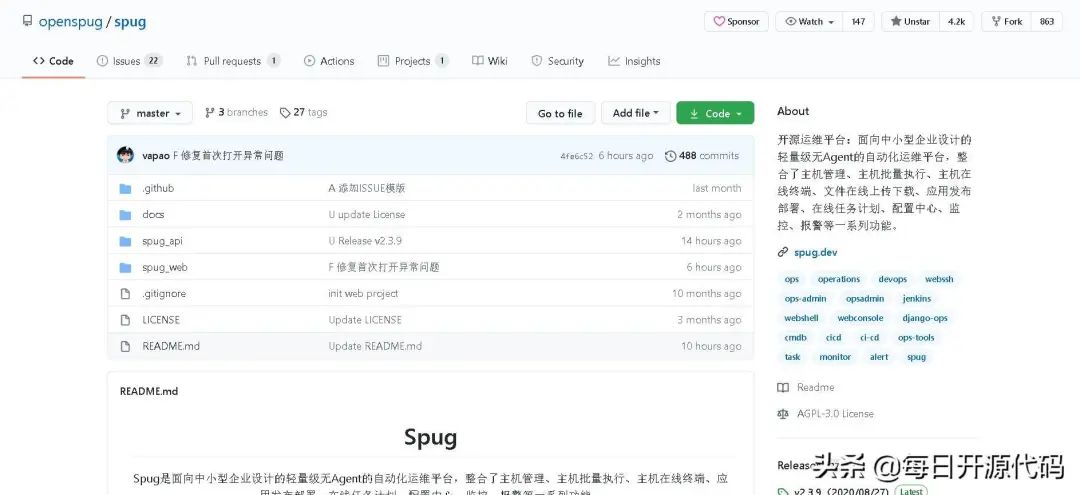 Spug,是 openspug 在 Github 上开源的自动化运维平台,项目位于 https://github.com/openspug/spug,同时在 Gitee 上维护,项目位于 https://gitee.com/openspug/spug,目前版本为 v2.3.9。