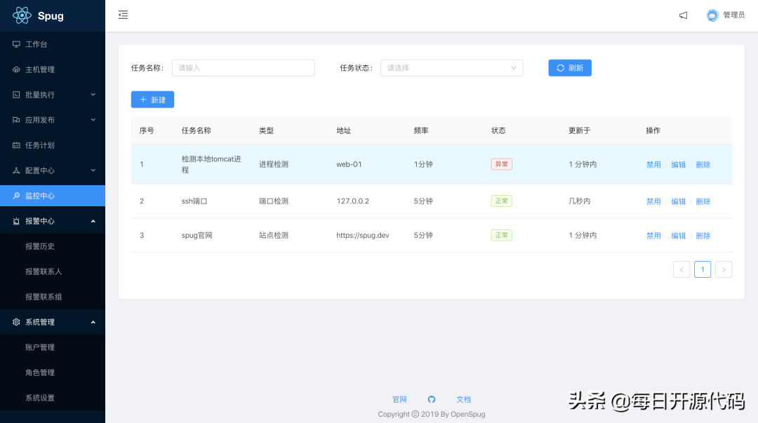 Spug 提供了监控中心,可以创建监控任务,对应用状态进行定时检测,如对端口进行定时的开放检测,对站点进行定时的连通检测等: