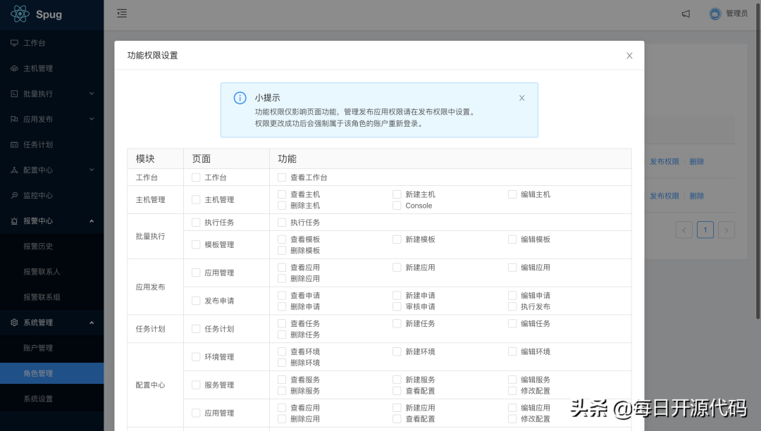 Spug 后台还可以进行功能权限设置,可以进行团队内部不同职责人员的权限管理: