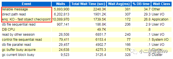抓一份问题时间段的awr,发现在问题时间段,数据库DBtime严重,主要等待事件为reliable message、direct path read、enq: KO – fast object checkpoint。