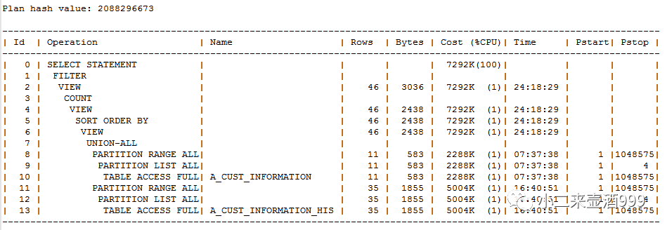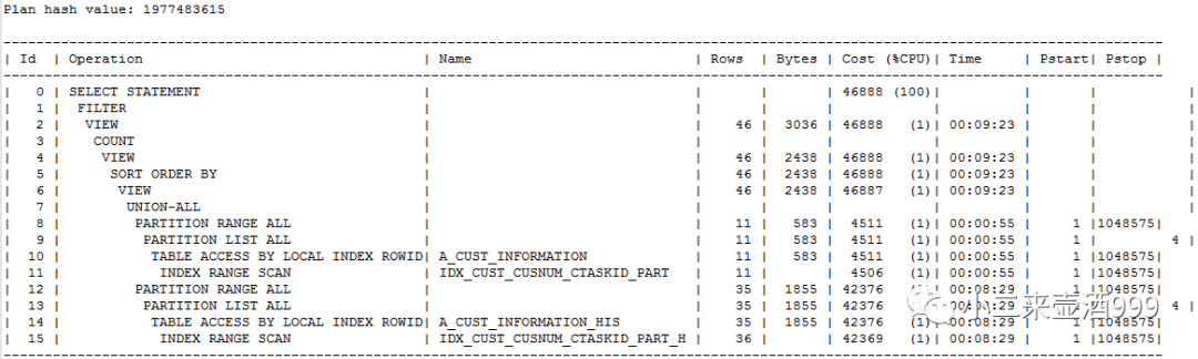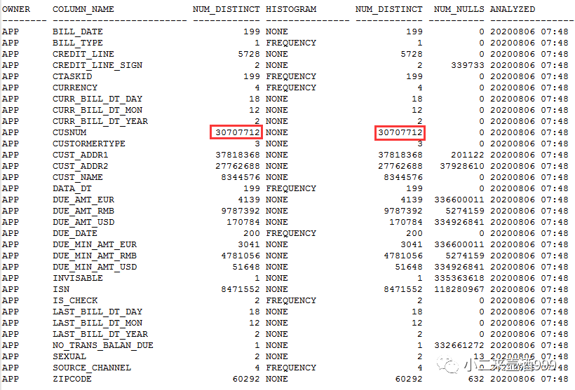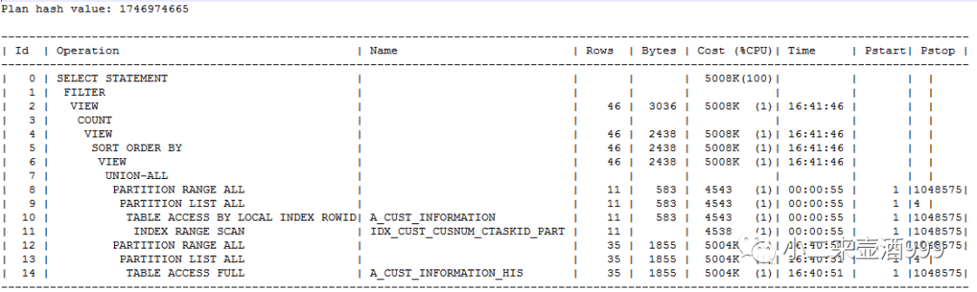 A_CUST_INFORMATION.CUSNUM字段和A_CUST_INFORMATION_HIS.CUSNUM分别存在索引,总行数3亿3千万,distinct值为3千万,选择率较好,执行计划走索引效率较高。