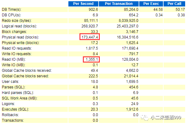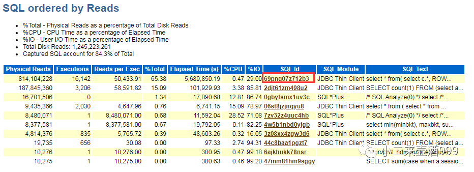 综合以上因素,IO上是存在压力的,查看数据库负载,每秒物理读为1355MB,很大,那么看看physical reads吧。