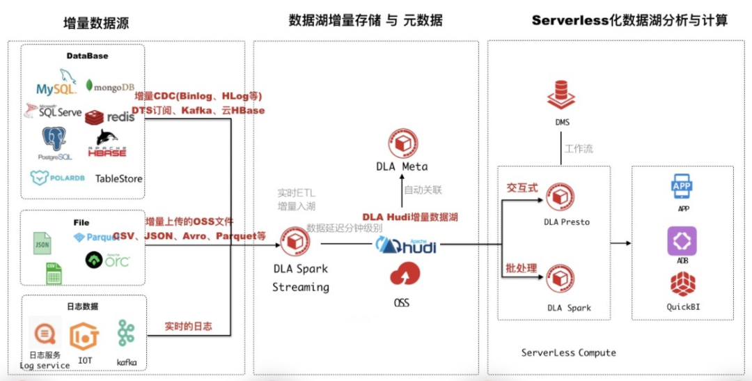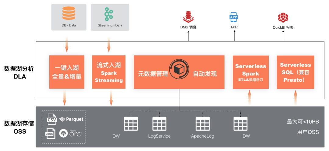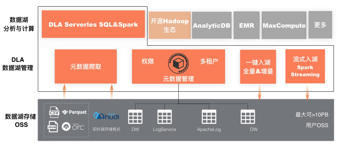 提供一站式的数据湖分析与计算服务,支持 ETL、机器学习、流、交互式分析,可以与OSS、数据库等多种数据源搭配使用;功能包括:数据入湖,元数据管理与自动发现,支持双引擎:【SQL(兼容Presto)分析、Spark计算服务】。其中数据湖管理这块会朝着更易用、更开放、更可靠方向迭代。