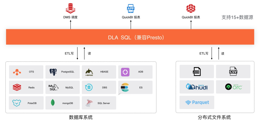 方案价值:DLA Serverless SQL(兼容Presto)支持15种以上的数据源的联邦分析。