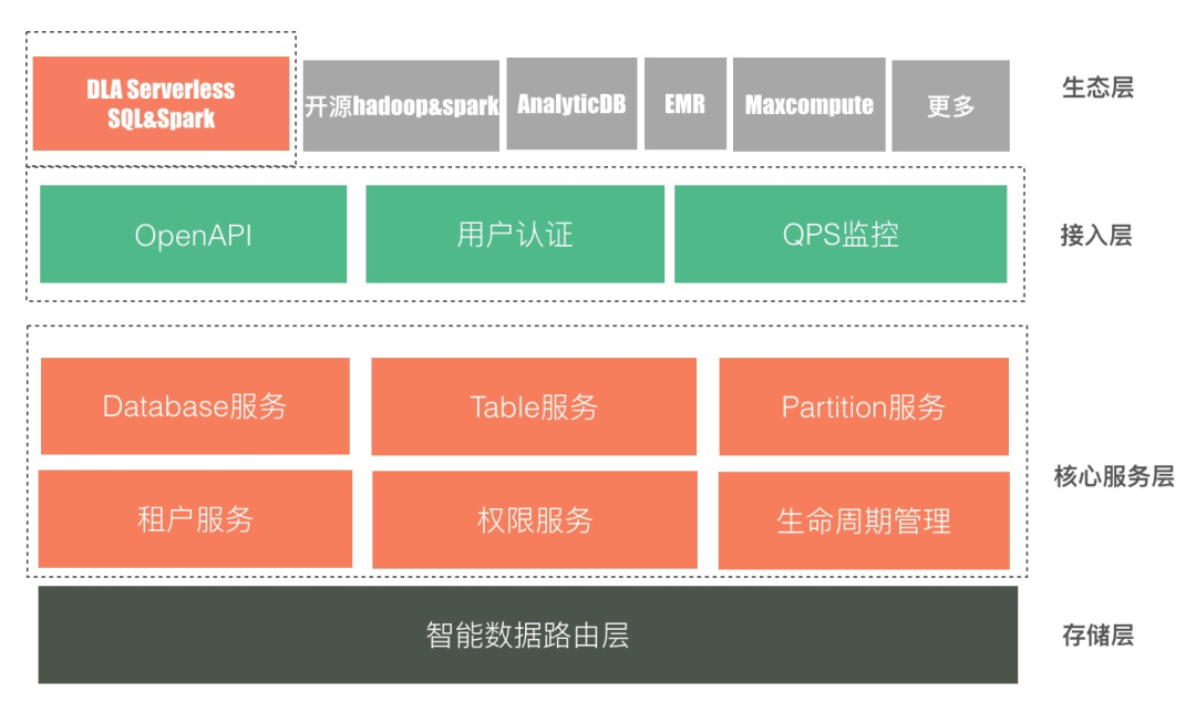 下面是数据湖分析服务DLA的元数据管理系统的架构图,整个元数据管理包含四个层次:存储层、核心服务层、接入层、生态层。