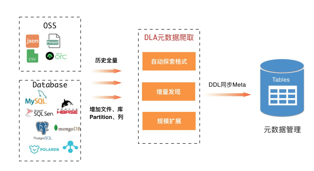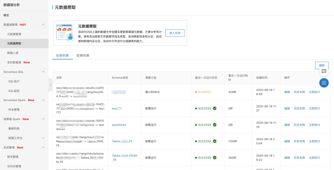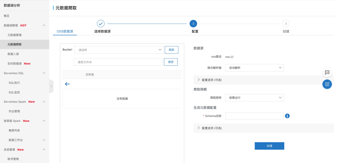 元数据爬取功能可以自动为OSS上面的数据文件创建及更新数据湖元数据,方便分析和计算。