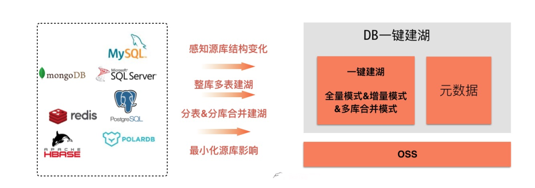 1) DataBase一键建湖:主要支持全量、增量、多库合并三种模式,支持OLTP的MySQL、SQLServer、POLARDB等,同时支持NoSQL的mongoDB等;