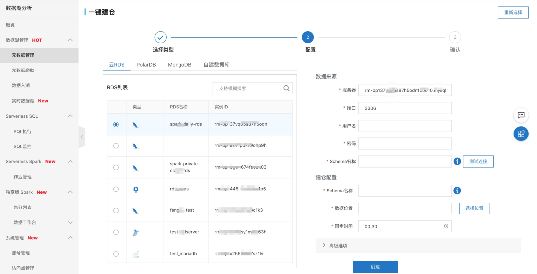 创建一键建湖:左侧选择数据源,可以包括RDS、PolarDB、MongoDB、ECS自建数据库;右侧配置源库的验证信息,以及在DLA生成的元数据名称即可。