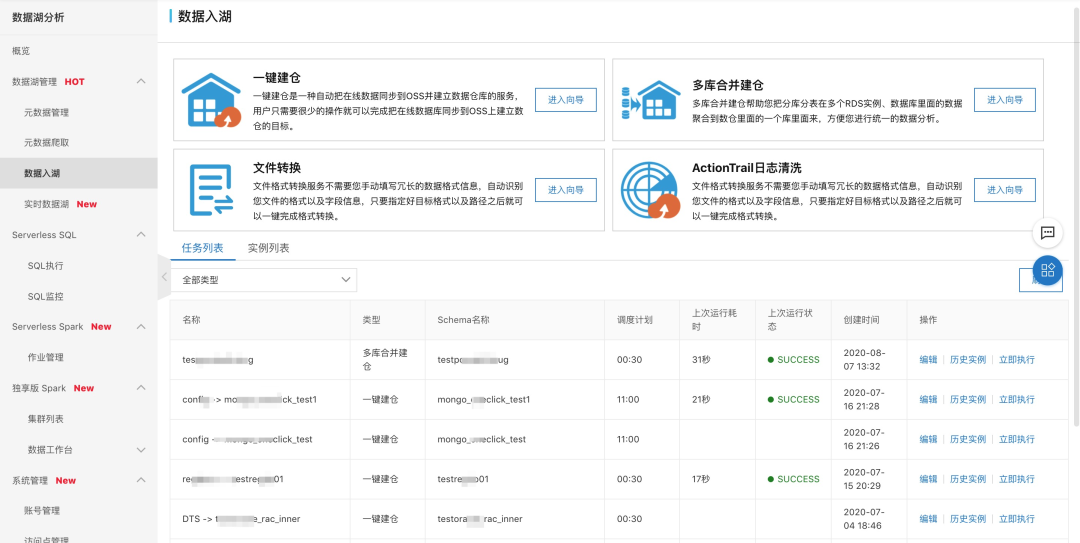 任务管理:对于周期运行的建湖任务可以进行全局的管理,以及对建好的湖进行分析。