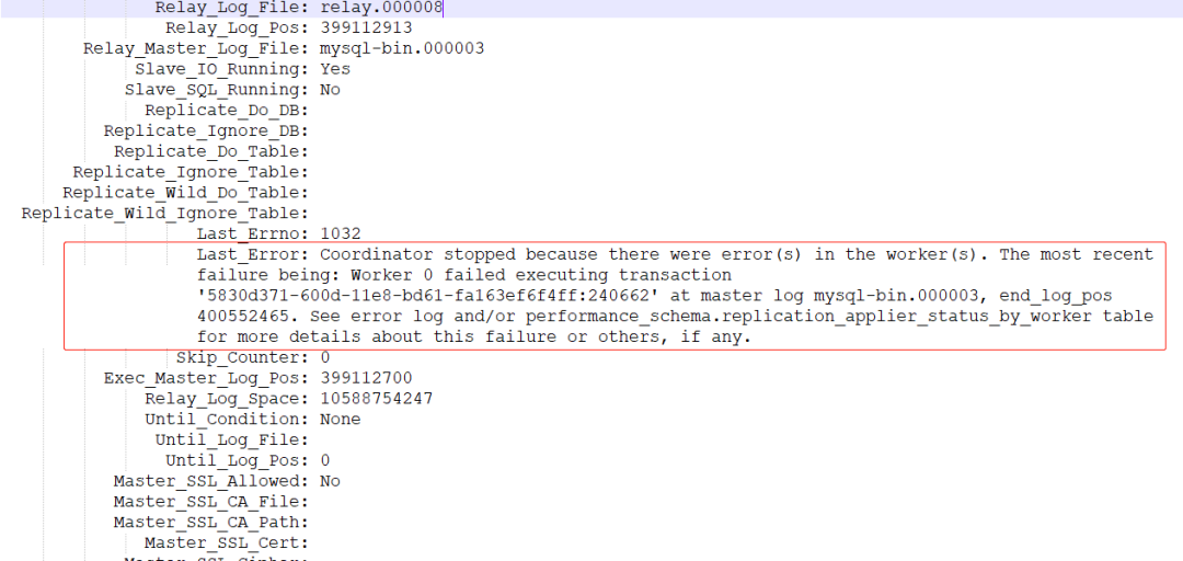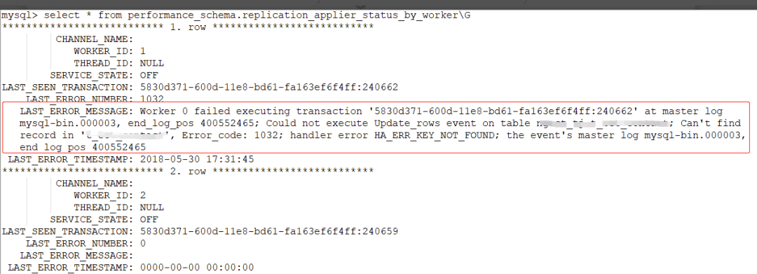 Mysql数据复制是在进行“5830d371-600d-11e8-bd61-fa163ef6f4ff:240662”事务操作时出现了“更新数据时,无法找到相应记录”错误。