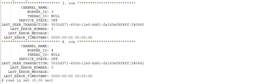 目前所有mysql主从采用4并发、半同步方式进行数据复制,以保证主从数据复制的效率与数据一致性。由本次具体出错信息看,当时正有4个线程在并发进行数据同步: