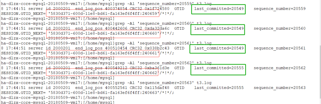 从“last_committed”值可以看出,事务“240659、240660、240661”并发运行,并同时提交,事务“240662”稍后提交。即在主库上,事务“240659、240660、240661”同时执行,事务“240662”随后执行。