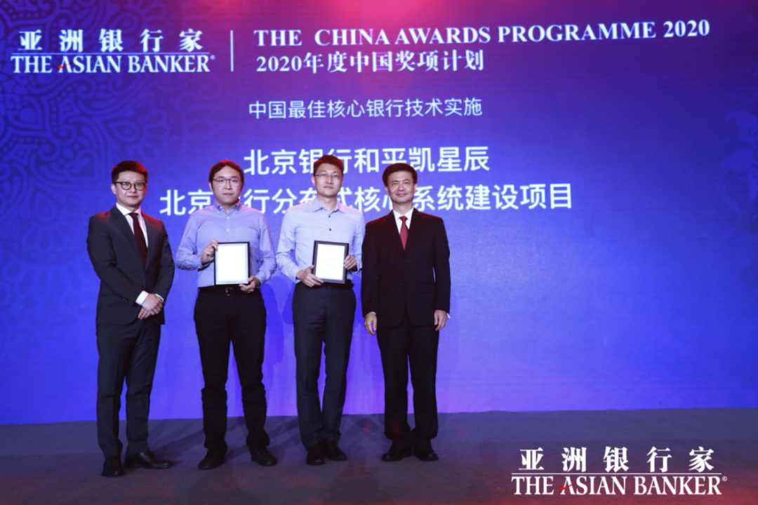 8 月 28 日,由国际权威财经杂志《亚洲银行家》主办的“ 2020 中国未来金融峰会”在深圳举行。北京银行和平凯星辰凭借双方在金融科技领域上的技术创新与卓越成效,携手荣获得 2020 年度亚洲银行家“中国最佳核心银行技术实施”大奖。