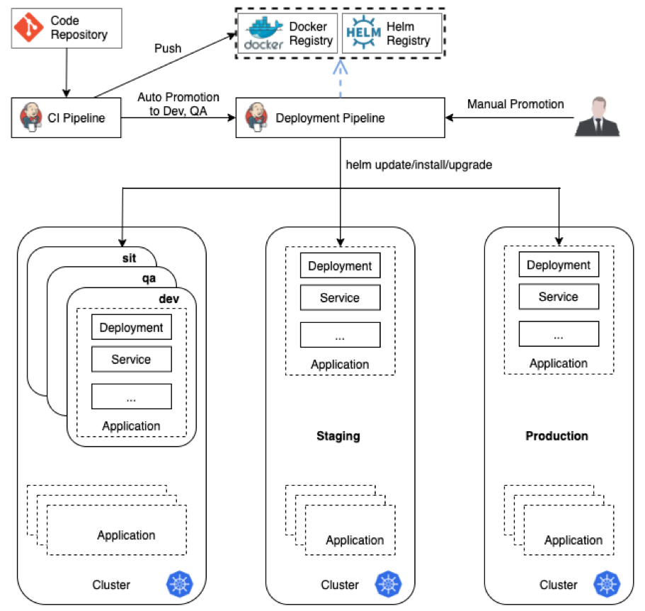 重复的部署资源文件,这一版中,我们是把Helm的模板文件和代码放在一个仓库里面,每次构建时都会打包出新版本的Helm Chart,其实也就是将Helm的版本和引用的Docker镜像版本更改成当前的版本。但是为了添加一个新的部署逻辑,比如添加Istio的资源文件以支持Istio服务网格,我们需要往多个代码仓库里添加Helm模板文件,工作量大不说,重复的手工操作也很容易出错。在版本2时,我们改变了策略,提取出了通用的Helm资源模板文件。