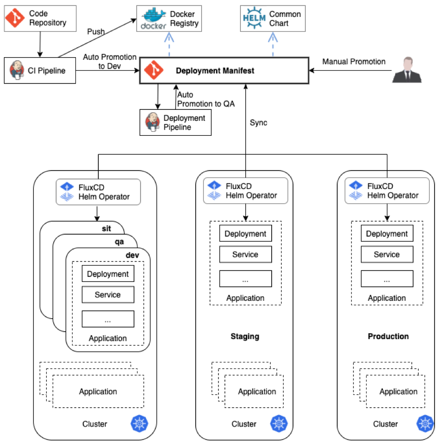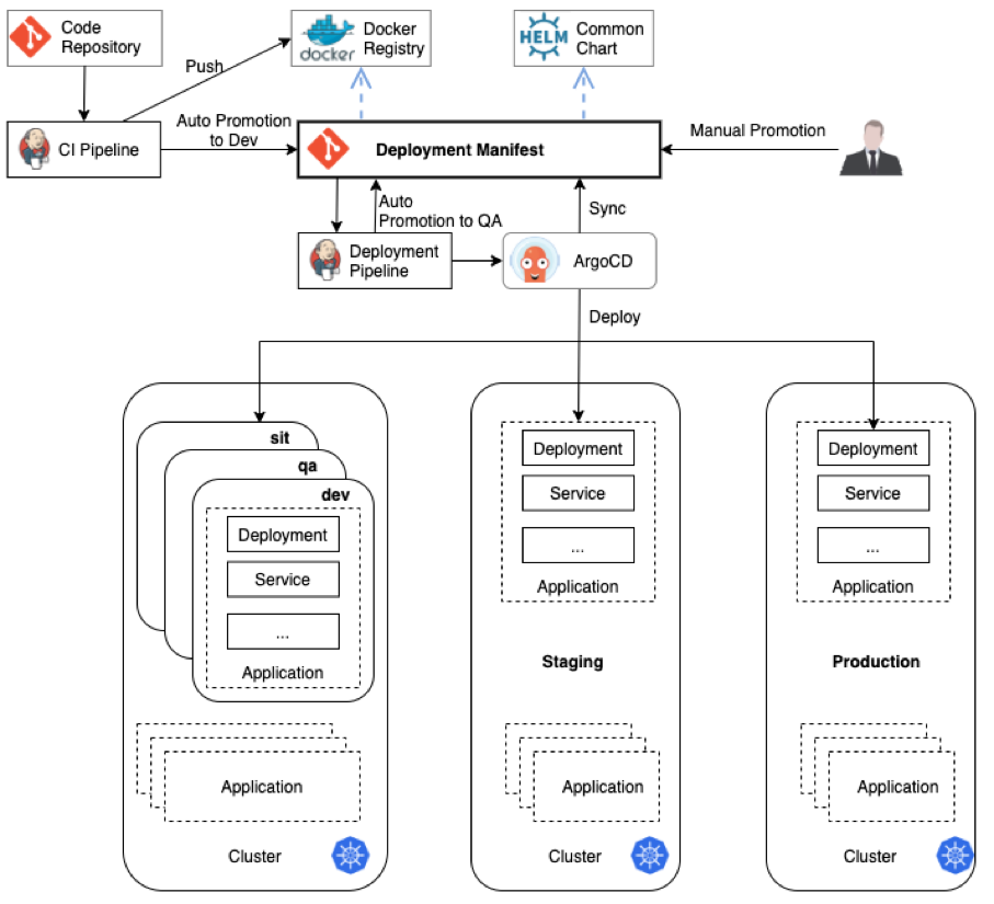 非不可变更部署(Non Immutable Deployment),这种推模型在部署完后,就不会持续监测Kubernetes集群中实际运行的资源是否与之前部署的版本一致。如果有人手动修改了Kubernetes集群中某个应用的资源,出现了问题,有时除了本人还真需要花点时间来定位。这种情况经常出现在开发环境,因为开发环境是面向开发人员的,所以我们是允许开发人员访问dev命名空间。