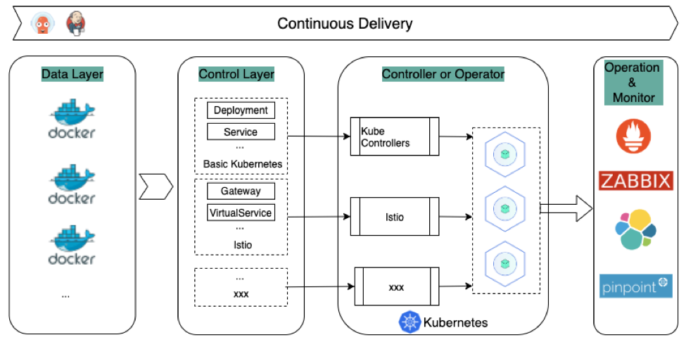 如果从静态的角度来看Kubernetes应用的部署,可以把Kubernetes的部署分为两个层面,数据层面和控制层面。数据层面就是包含应用代码的Docker镜像,而控制层面则是Kubernetes的资源文件,比如Deployment、Service和Ingress等,它们负责把Docker镜像安全、正确地安装在Kubernetes集群中,并打通从集群外到应用的网络流量。Kubernetes应用的持续交付流水线就是持续地将最新部署需求也就是部署资源文件同步到Kubernetes集群中,让应用按照规定的方式运行。Kubernetes的Controller和Operator等扩展方法使得第三方组件能够提供越来越多的部署资源类型,让我们可以更好地控制应用的部署和运行。比如,如果想让Istio服务网格来托管应用的流量管理,我们可以添加Istio组件提供的部署资源类型,通过持续交付流水线同步到Kubernetes集群中。如下图所示,通过使用不同类型的部署资源,未来我们可以把应用自动对接到不同的运维监控平台上,使得Kubernetes应用的持续交付流水线真正地成为一个从 Dev到Ops的端到端的完整交付链。