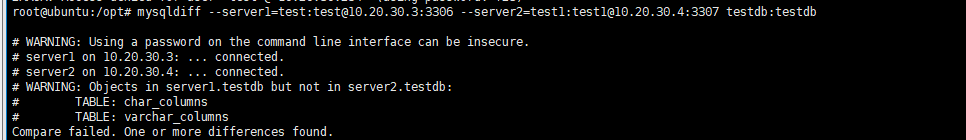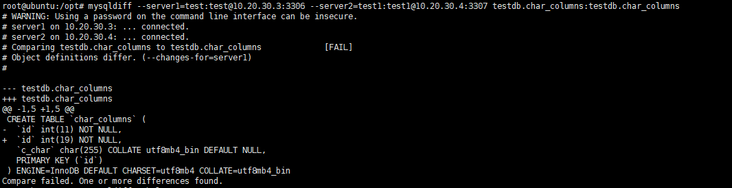 mysqldiff--server1=test:test@10.20.30.3:3306--server2=test1:test1@10.20.30.4:3307 testdb.char_columns:testdb.char_columns