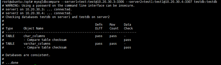 mysqldbcompare--server1=test:test@10.20.30.3:3306--server2=test1:test1@10.20.30.4:3307 testdb:testdb