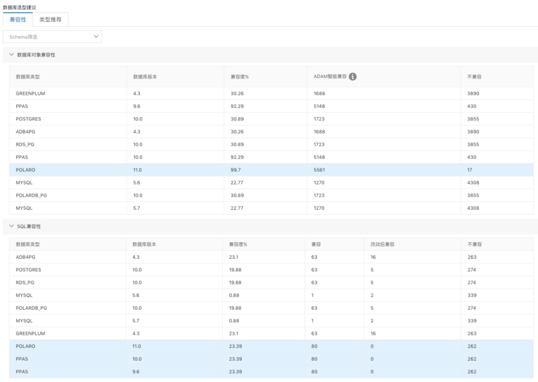 如下图示例,针对某客户的语法使用特性进行分析,识别出该数据库属于“结构复杂、实时性要求高”的联机事务型,推荐OLTP型数据库;第二步,针对目前市面上主流的事务型数据库进行DDL和SQL的语法兼容性分析,并根据ADAM能支持的2000+自动转换规则评估出最终兼容性。ADAM不做强制捆绑,只提供公正的评估报告,由客户来最终决策要选择的目标数据库。