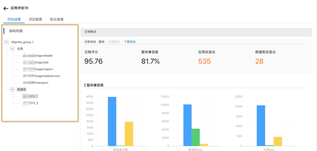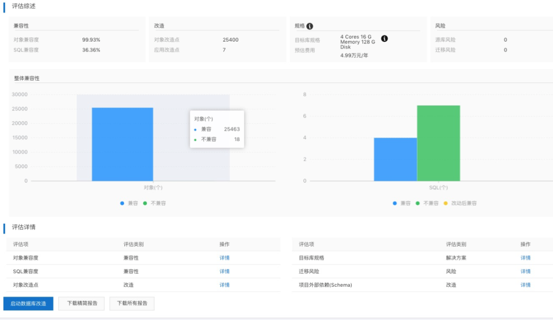 如下图某客户示例,可以直观的看到数据库DDL兼容性、SQL兼容性,改造点数量、目标库成本(未打折预算)、风险数量等,点击详情可看到每个对象的具体兼容性情况。